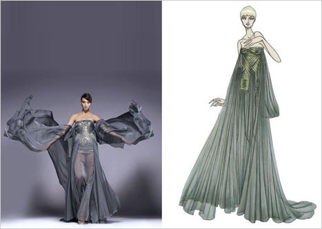 Elbiseleri çizimleriyle birlikte görmek, tasarımcıların vizyonunun elbiselerinin de ötesinde olduğunu gösteriyor. Bir de ince bir belin bir elbisenin güzel görünmesi için ne kadar önemli olduğunu, çizimlerle gerçeği yanyana görünce daha iyi anlıyorsunuz.
